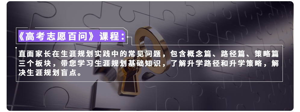 《高考志愿百问》直面家长在生涯规划实践中的常见问题,包含概念篇、路径篇、策略篇三个板块,带您学习生涯规划基础知识,了解升学路径和升学策略,解决生涯规划盲点。