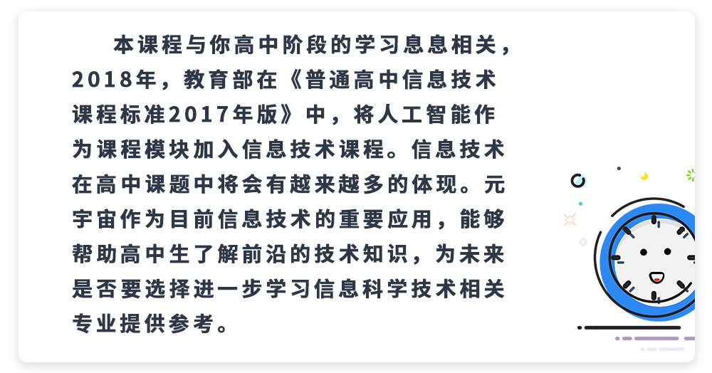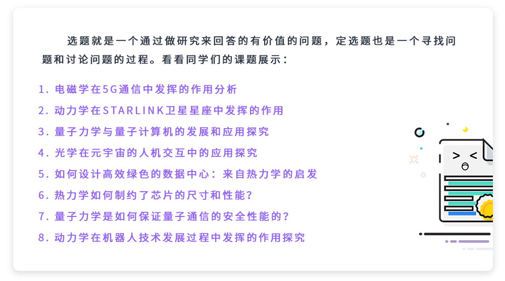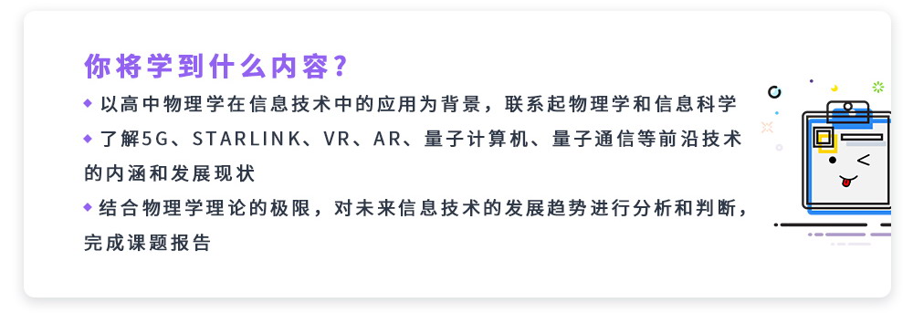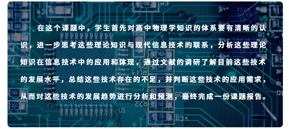 本课题属于物理类方向,文理生均适合学习,可以从理论或技术角度出发讨论,内容包括基础的物理理论和最前沿的技术,通过将基础的物理理论与前沿的信息技术相结合,调研信息技术的发展历史和发展趋势,对未来的技术发展方向进行预判。在研究过程中,带你熟悉基本的文献调研和报告写作方法,并尝试具体问题的解决,最终完成一份课题报告。整个课程分为六次,每次30分钟,分别讲述课题本身知识,并进行学术写作训练,为你以后进入大学学习奠定基础。