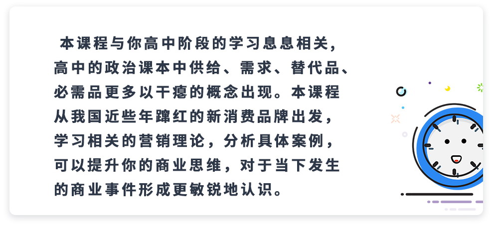 本课题属于经管类方向,文理生均适合学习,内容与你的生活息息相关,通过身边接触的新消费品牌,让你思考这些迅速蹿红的新消费品牌背后有怎样的营销策略。在研究过程中,带你学习传统的营销理论,了解零售模型和渠道知识,结合相关的案例进行分析,提升学生的商业思维。整个课程分为六次,每次30分钟,分别讲述课题本身知识,并进行学术写作训练,为你以后进入大学学习奠定基础。
